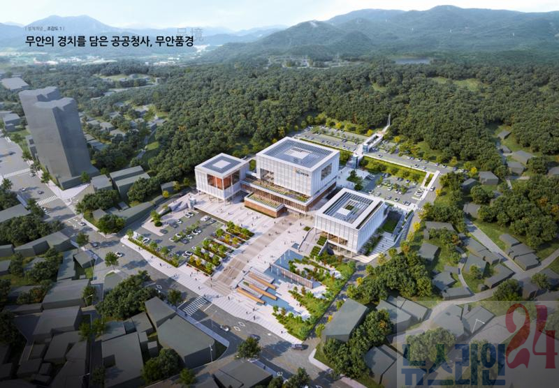 신청사 공모 당선작 조감도전남 무안군(군수 김산)은 12월 8일 신청사 건립을 위한 설계공모에서 ㈜정일엔지니어링종합건축사사무소, ㈜리가온건축사사무소 컨소시엄 작품 ‘무안品경’을 최종 당선작으로 선정했다고 밝혔다.