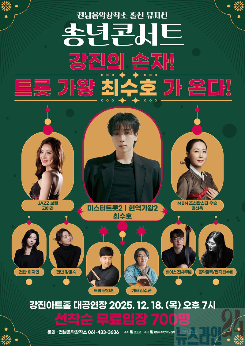 (재)강진군문화관광재단 전남음악창작소가 오는 18일 강진아트홀 대공연장에서 2025년 한 해의 성과를 군민과 나누는 특별 기획공연 「2025 전남음악창작소 뮤지션 송년콘서트」를 개최한다.