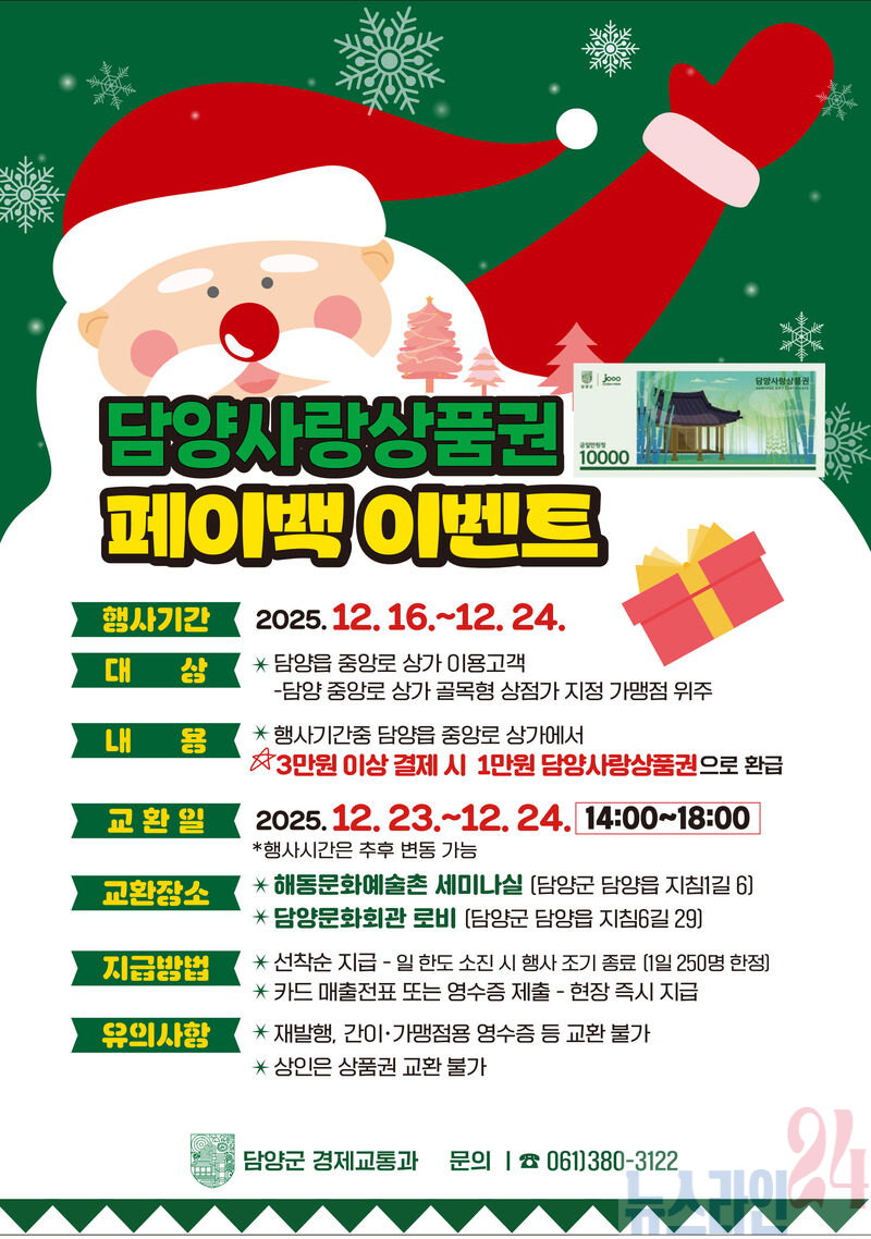 담양군(군수 정철원)은 연말 소비 진작과 지역 상권 활성화를 위해 12월 23일부터 25일까지 담양읍 중앙로와 담양시장 일원에서 ‘담양사랑상품권 페이백 행사’를 운영한다.