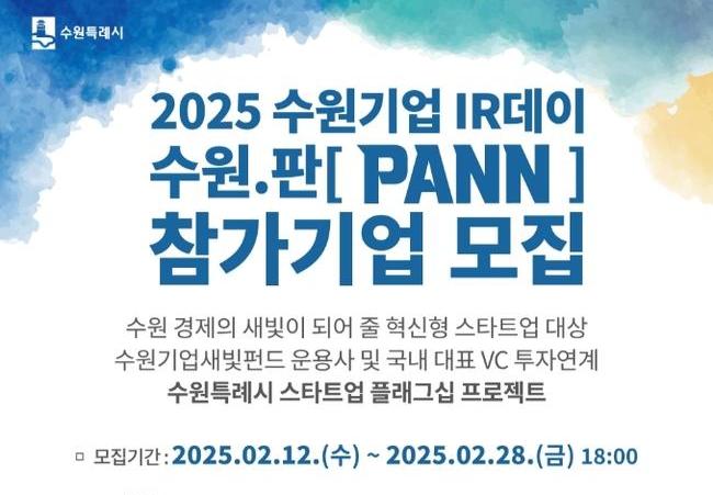수원시(시장 이재준)가 `2025 수원기업 IR데이 수원.판(PANN)`에 참여할 기업을 2월 28일까지 모집한다.