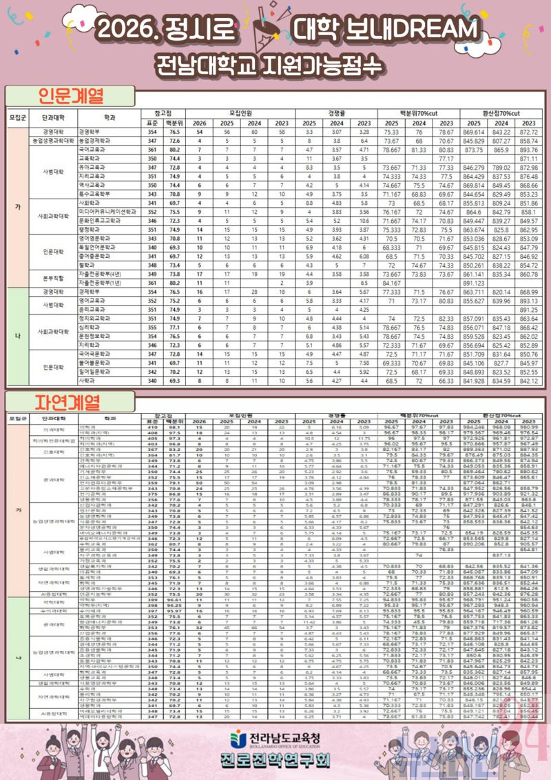 전라남도교육청은 진로진학연구회 수시·정시 배치표 개발팀이 분석·제작한 ‘표준점수 정시로 대학 보내DREAM’ 정시전형 표준점수 배치표를 도내 고등학교에 순차적으로 배포한다.