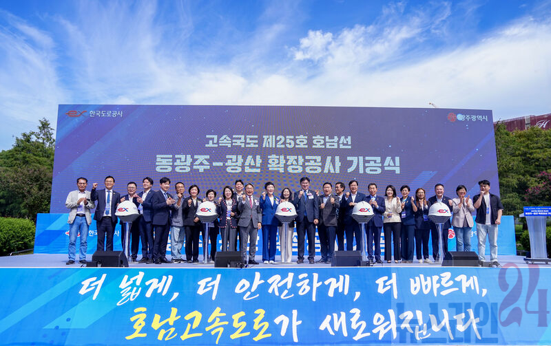 강기정 광주광역시장이 지난 9월22일 오전 북구 국립광주박물관 정원에서 열린 '호남고속도로 동광주IC-광산IC 확장공사 기공식'에 참석해 함진규 한국도로공사 사장, 전진숙·정준호 국회의원 등 내빈들과 기념촬영을 하고 있다. 광주시가 도시 거점을 긴밀히 연결하고 교통혼잡을 해소하기 위한 도로망 확충 사업을 내년에도 이어간다.광주광역시(시장 강기정)는 2026년도 도로사업 정부 예산 653억원을 확보, 총 1251억원을 투입해 9건의 도로 사업을 진행한다고 29일 밝혔다.