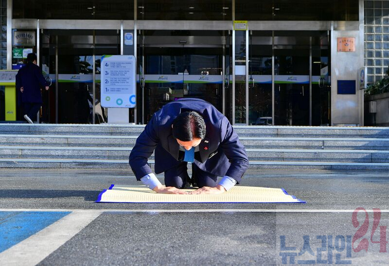 김한종 군수가 2일 군청 앞에서 군민을 향해 큰절을 올리고 있다