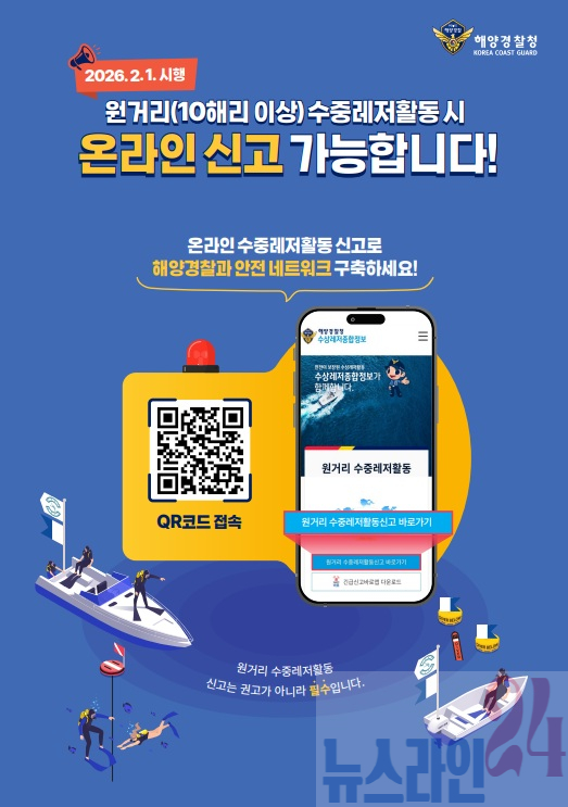 서해해경청에 따르면, 1월 6일부터 1월 31일까지 모바일 원거리 수중레저활동 신고 시범운영을 실시해 「수중레저법」개정 시행에 앞서 안전한 수중레저활동을 지원하고 사고 예방을 강화한다.