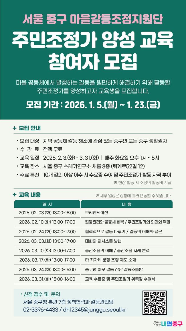 중구 주민조정가 양성 교육 참여자 모집 포스터.8일 서울 중구는 주민 스스로 마을 갈등을 조정하고 공동체 신뢰를 회복할 수 있도록 돕는 ‘제2기 주민조정가 신규 양성 교육’ 참여자를 공개 모집한다고 밝혔다. 이번 모집은 2024년 마을갈등조정지원단 제1기 주민조정가 운영에 이은 후속 과정으로, 주민 주도의 갈등 해결 체계를 확장하기 위한 취지다.