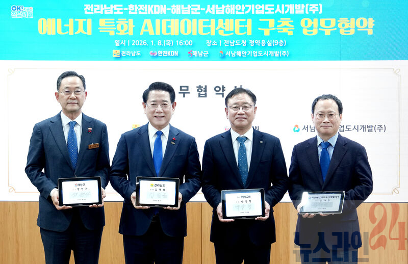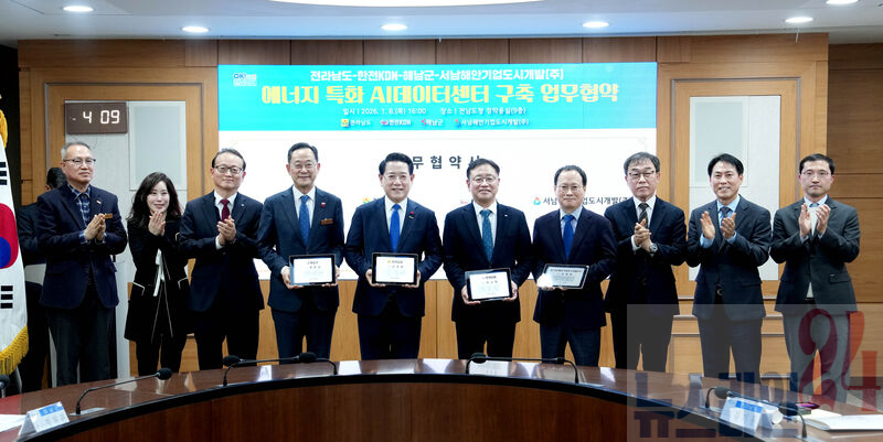 전라남도는 8일 한전KDN, 해남군, 서남해안기업도시개발㈜와 에너지 특화 AI 데이터센터 구축 및 AI·에너지 신산업 육성을 위한 업무협약을 했다.