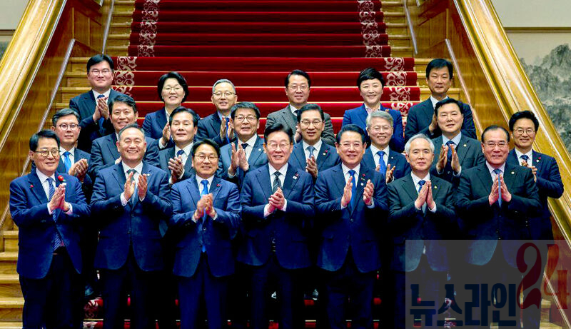 이재명 대통령이 9일 광주·전남 지역구 국회의원들과 김영록 전남지사, 강기정 광주시장을 청와대로 초청해 오찬 간담회를 갖고 기념촬영을 하고 있다.