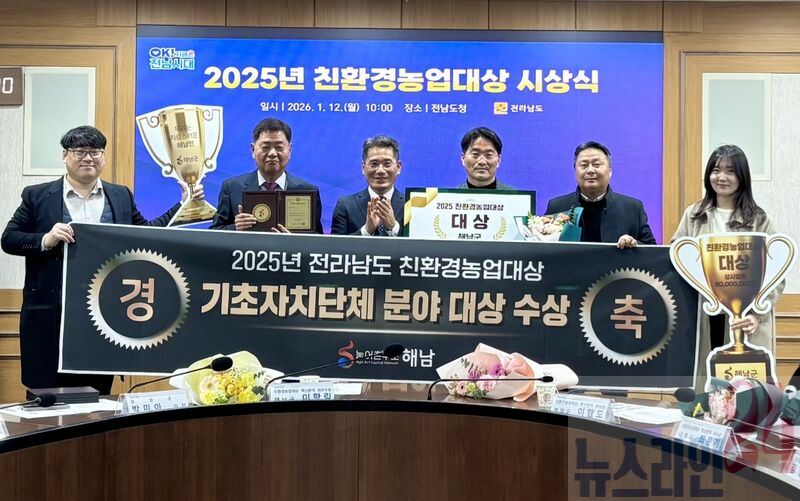 해남군이 전라남도‘2025년 친환경농업대상’평가에서 대상을 수상했다. 2년연속 대상 수상으로, 우리나라 친환경농업 선도 지자체의 위상을 확고히 했다. 해남군은 상사업비 8,000만원도 확보했다.