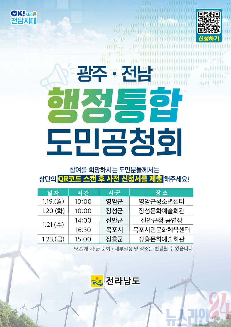 전라남도는 광주·전남 행정통합에 대한 도민 의견을 수렴하기 위해 19일 영암군을 시작으로 22개 시군을 돌며 도민공청회를 개최한다고 밝혔다.