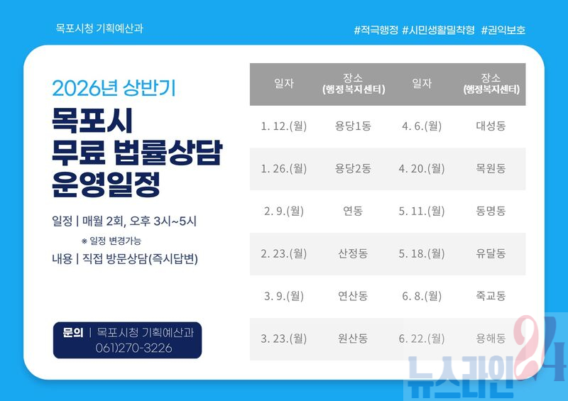 한편, 상담 일정은 사정에 따라 변경될 수 있으며, 무료 법률상담과 관련한 자세한 사항은 목포시청 기획예산과(061-270-3226)로 문의하면 된다.