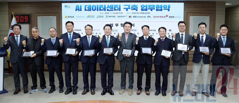 강진군은 지난 16일 전라남도청 서재필실에서 전라남도, ㈜베네포스와 함께 ‘강진 AI 데이터센터’ 건립을 위한 업무협약(MOU)을 체결했다. 이날 협약식에는 강진원 강진군수, 김영록 전남도지사, 이현효 ㈜베네포스 회장을 비롯해 대우건설, KT 등 사업 참여사 관계자들이 참석해 사업 추진에 대한 강력한 의지를 확인했다.
