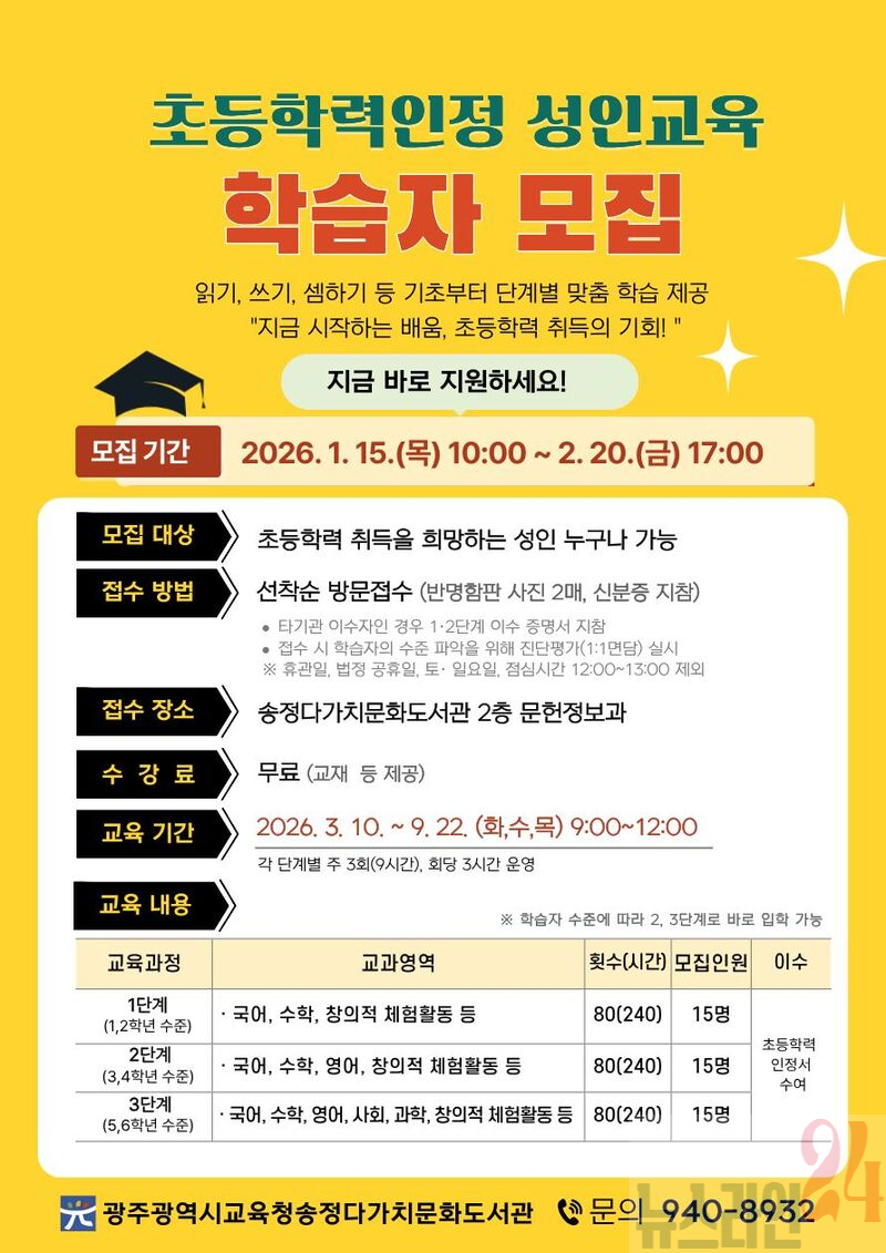 교육은 초등학력 취득을 희망하는 성인이면 누구나 참여 가능하며 단계별 15명씩 총 45명을 선착순으로 모집한다. 교재를 포함한 수강료는 전액 무료다.