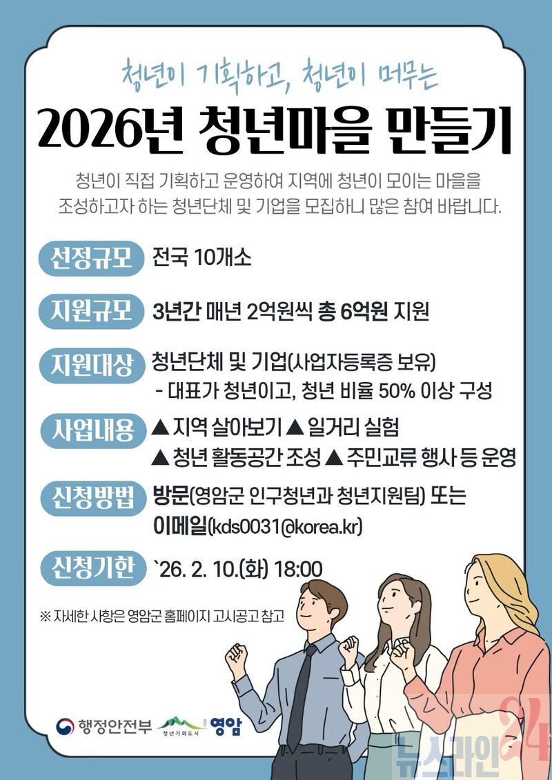 영암군이 행정안전부 ‘2026 청년 마을 만들기 사업’에 참여할 청년단체를 다음달 10일까지 공개 모집한다.