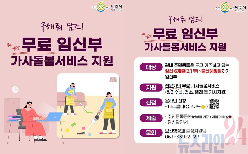 나주시(시장 윤병태)는 임신으로 인해 일상적인 가사 활동이 어려운 임신부를 대상으로 전문 가사돌봄 서비스를 제공하는 ‘임신부 가사돌봄서비스 지원사업’을 지난해에 이어 올해도 운영한다고 22일 밝혔다.