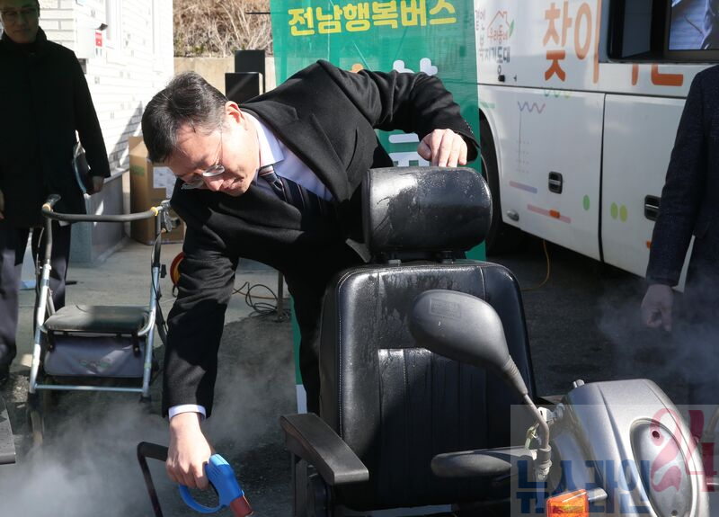 명창환 전남도 행정부지사가 17일 보성 동암마을에서 개최된 「찾아가는 전남행복버스」 2025년 도민속으로 출발식에 참석, 스팀으로 어르신 전동차를 소독하고 있다.