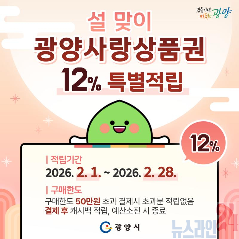 광양시는 설 명절을 맞아 지역 내 소비를 촉진하고 민생경제 회복을 지원하기 위해 2월 1일부터 28일까지 한 달간 광양사랑상품권 캐시백 적립률을 기존 10%에서 12%로 한시 상향 운영한다고 밝혔다.