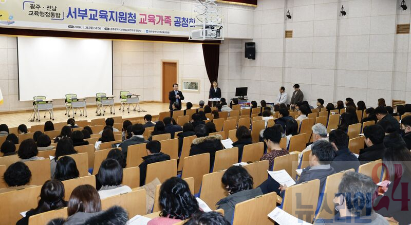 광주시교육청(교육감 이정선)은 26일 광주시교육청교육연수원 중강당에서 서부권 교직원, 학부모, 시민 등을 대상으로 ‘광주·전남 교육행정통합’ 추진 현황 공유 및 의견 청취를 위한 공청회를 개최했다.