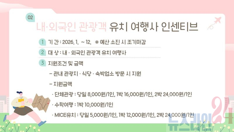 지원 금액은 단체관광 기준으로 당일 관광 시 1인당 8천 원, 1박 1만6천 원, 2박 2만4천 원이며, 수학여행은 1박 기준 1인당 1만 원이 지원된다.