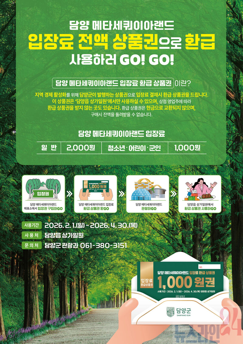 앞서 담양군은 2025년 대나무축제 기간 메타세쿼이아랜드와 죽녹원 입장료 환급 상품권을 발행해 약 452억 원 규모의 지역경제 파급효과를 거둔 바 있다.