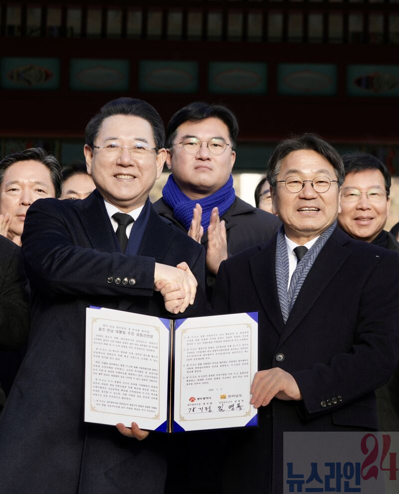 강기정 광주광역시장과 김영록 전라남도지사가 지난 1월2일 국립5·18민주묘지에서 '통합 지방정부 추진 공동선언문'을 발표한 후 기념촬영을 하고 있다. 강기정 광주광역시장은 30일 ‘전남광주통합특별시 설치를 위한 특별법안’이 국회에 발의된 것과 관련해 “부강한 광주전남을 만들기 위해 지난 4주 동안 쉼 없이 달려온 지금, 참으로 기쁘고 의미있는 성과를 이뤘다”며 “시민 여러분의 관심과 지지가 있었기에 가능했다”고 소회를 밝혔다.