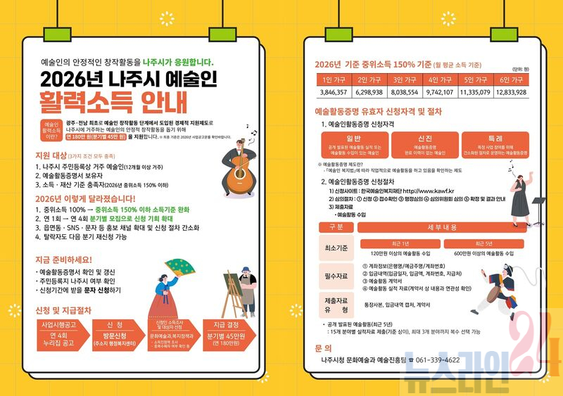 나주시(시장 윤병태)는 예술인의 최소한 생활 안정을 도모하고 창작 활동을 지속할 수 있도록 지원하는 ‘2026 예술인 활력소득 지원금’을 오는 3월 3일까지 신청받는다고 2일 밝혔다.