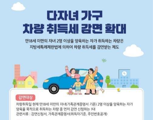 이번 개정으로 만 18세 미만 자녀 2명을 양육하는 가구는 2025년 1월 1일 이후 취득해 등록하는 차량에 대해 취득세를 최대 50%까지 감면을 받을 수 있다.