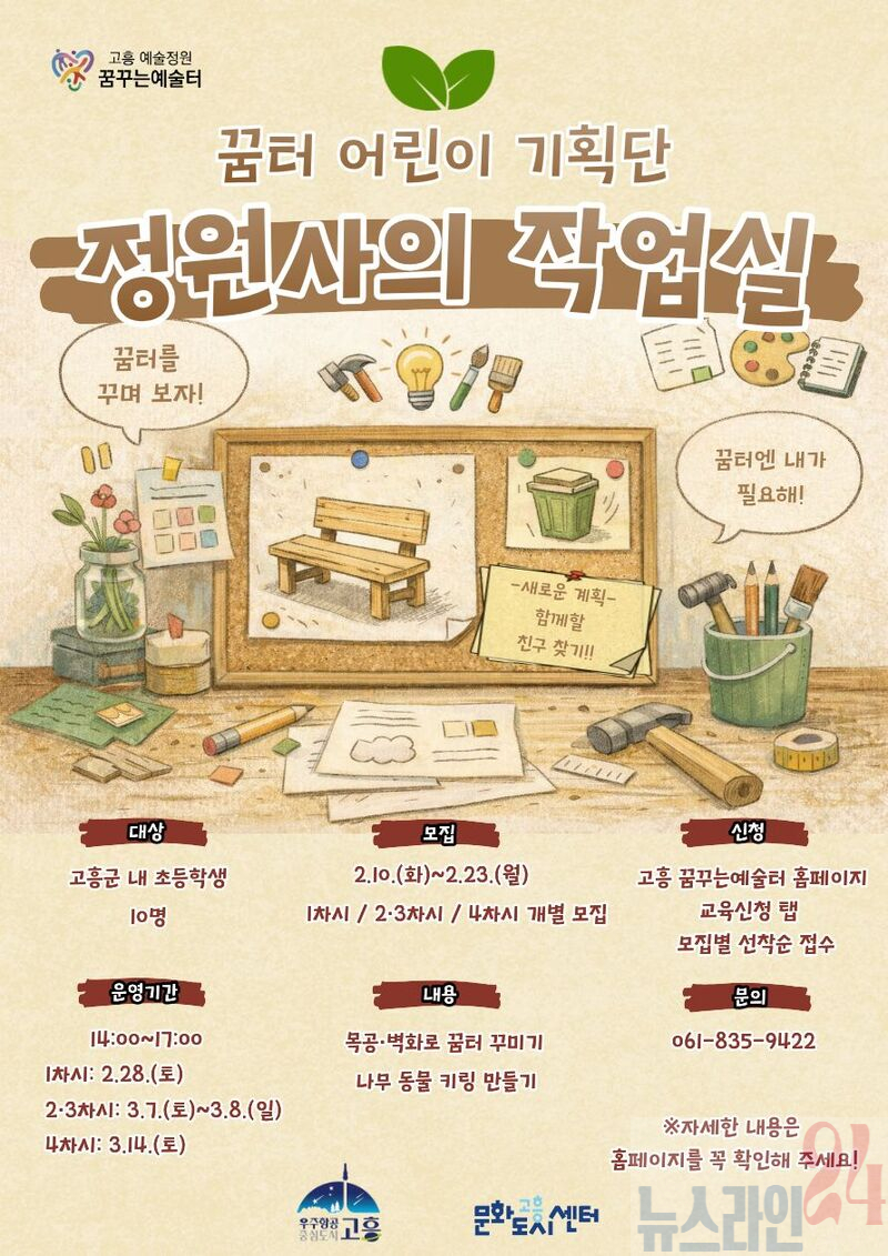 고흥군(군수 공영민)은 오는 2월 10일부터 23일까지 꿈터 어린이 기획단 「정원사의 작업실」에 참여할 지역 내 초등학생 10명을 선착순으로 모집한다고 밝혔다.