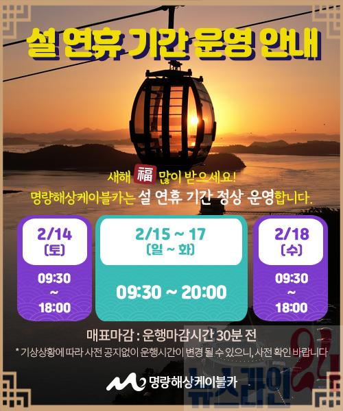 명량해상케이블카는 2026년 설 연휴를 맞아 2월 15일부터 설날 당일인 17일까지 3일간 정상 운영과 함께 야간 연장 운행을 실시한다. 기존 오후 6시까지였던 운행 시간을 오후 8시까지 2시간 연장해 귀성객과 관광객들의 이용 편의를 높인다.