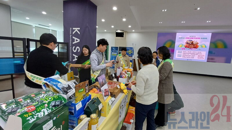 이날 행사에는 우주항공청 임직원을 대상으로 고흥군과 사천시의 특산품 판매가 진행됐다. 고흥군은 유자차, 김·미역, 다시마 세트, 한라봉 등 설 명절 선물용 특산품을 선보였으며, 사천시도 쌀, 토마토, 딸기잼 등 지역 우수 농특산물을 함께 판매했다.