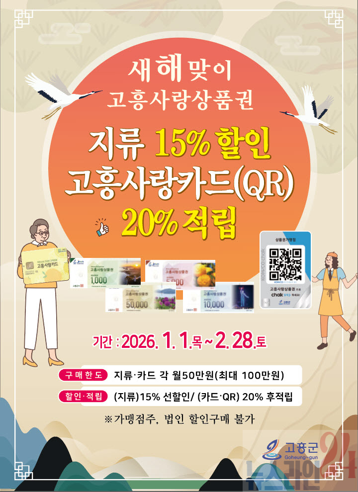 군은 지난 1월 1일부터 오는 2월 28일까지 ‘새해맞이 고흥사랑상품권 특별할인 행사’를 진행 중이다. 지류형 상품권은 15% 할인된 가격으로 판매하고 있으며, 카드·모바일형 고흥사랑상품권 결제 시 20% 적립 혜택을 제공하고 있다. 특히 20% 적립 혜택은 상품권 도입 이후 처음 시행되는 역대 최대 규모로, 명절을 준비하는 군민들에게 파격적인 혜택이 될 것으로 보인다.