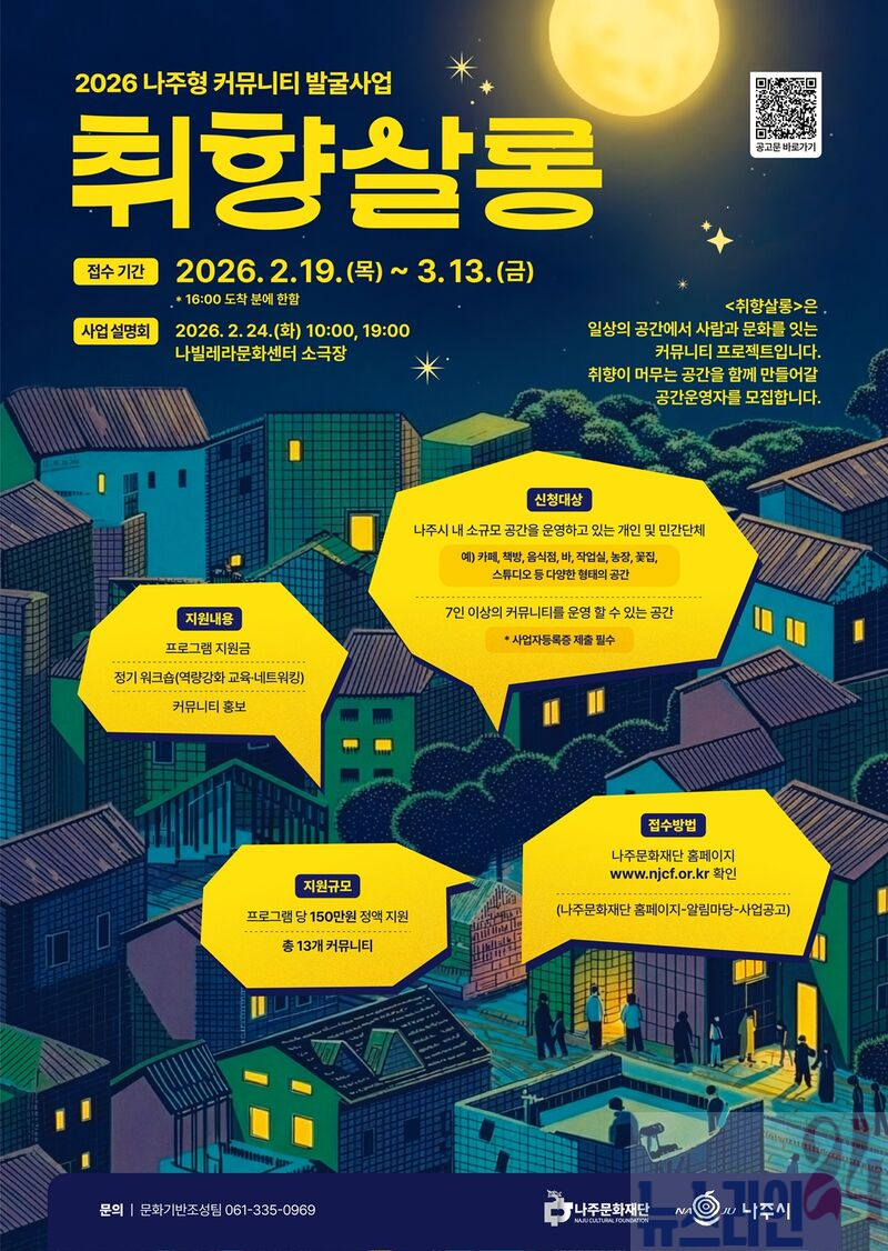 재단은 시민 주도의 생활문화를 활성화하고 지역 기반 커뮤니티를 발굴 및 육성하기 위해 2026 나주형 커뮤니티 발굴사업 ‘취향살롱’에 참여할 공간운영자를 오는 3월 13일까지 모집한다고 13일 밝혔다.