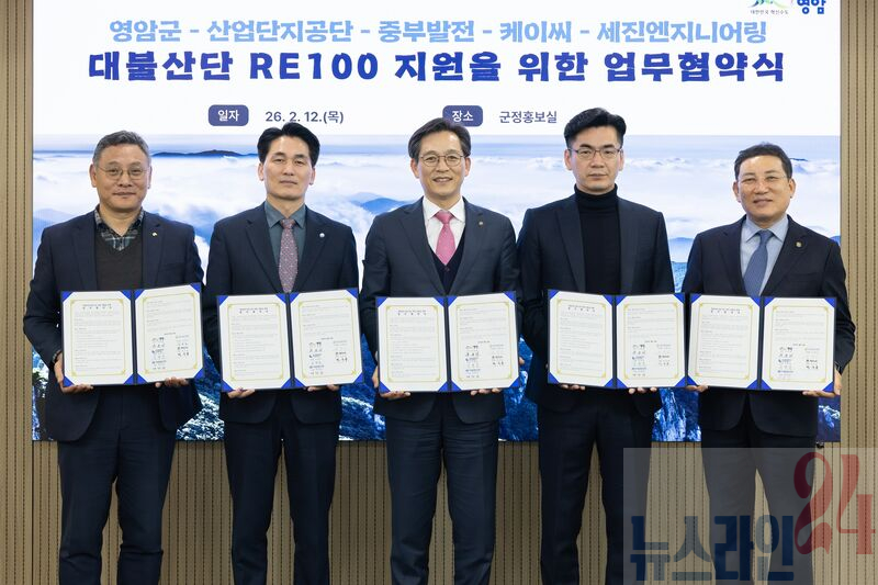 영암군이 12일 군청에서 한국산업단지공단, 한국중부발전(주), 케이씨(주), ㈜세진엔지니어링과 ‘대불산단 RE100 지원 업무협약’을 맺었다.
