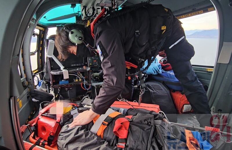 서해해경청 소속 응급구조사가 헬기로 옮겨진 환자를 이송중에도 응급처치 하고 있다.