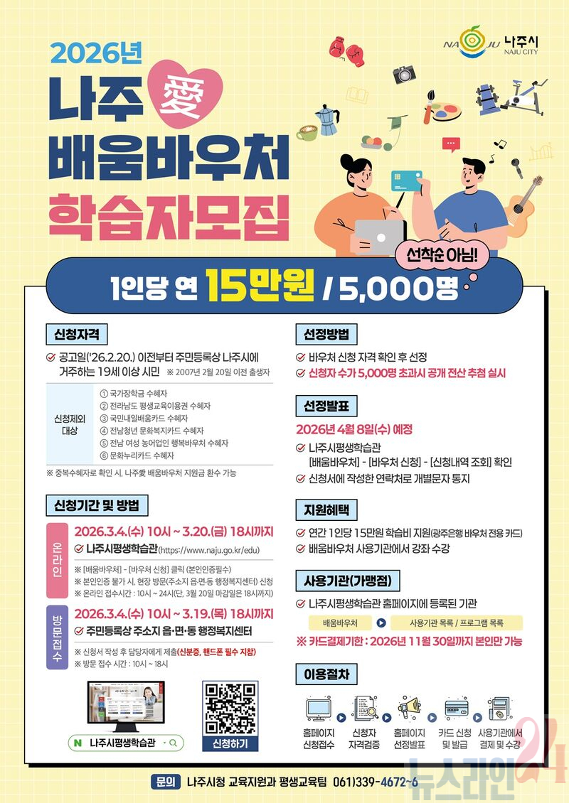 나주시는 19세 이상 시민을 대상으로 연간 15만 원을 바우처 전용 카드로 지원하는 ‘나주애배움바우처’ 학습자 신청을 3월 4일부터 20일까지 접수한다고 23일 밝혔다.