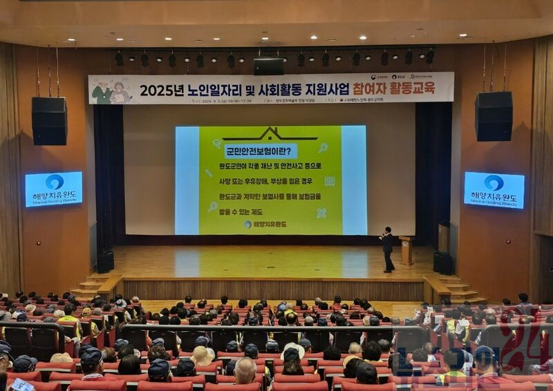 사진은 지난해 개최환 완도군 노인 일자리 및 사회 활동 사업 참여자 교육완도군의 65세 이상 인구는 17,383명으로 전체 인구(44,613명) 대비 38.9%를 차지하고 있으며, 지난해 대비 1.6% 상승, 매년 증가하는 추세다.