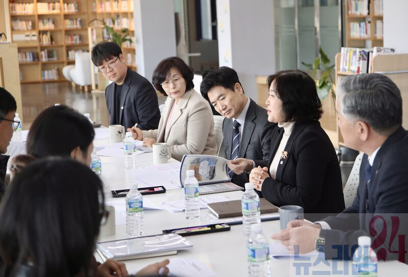 25일 장흥장평중학교에서 김대중 전남교육감과 장흥장평중학교 교육가족들이 새학년 준비상황을 공유하고 신입생 적응 지원과 안전한 교육활동 운영 방향을 논의하고 있다.