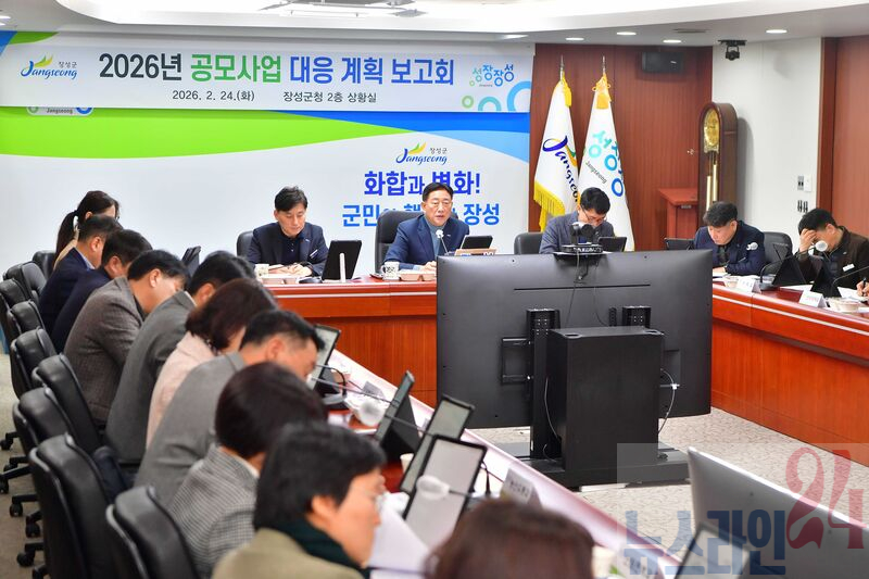 24일 장성군청 상황실에서 김한종 군수 주재 ‘2026년도 공모사업 대응계획 보고회’가 열렸다 [장성군]장성군이 올해 공모사업 발굴을 위해 전략적인 대응에 나섰다. 군은 24일 군청 상황실에서 김한종 군수 주재로 ‘2026년도 공모사업 대응계획 보고회’를 열었다.
