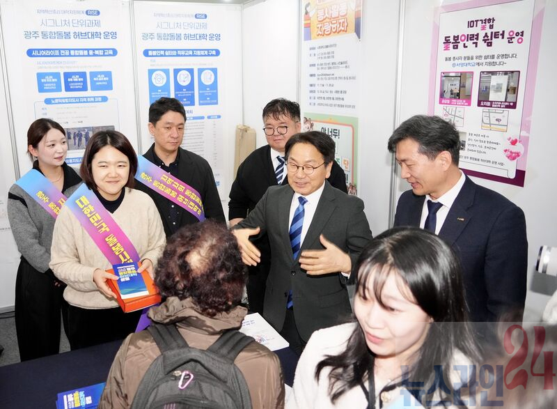 대한민국 돌본시대 전국대회에서 인사말하는 강기정 시장행사장에는 13개 기관이 참여한 홍보부스도 운영됐다. 광주 5개 자치구를 비롯해 국민건강보험공단, 국민연금공단 등 전문기관과 광주라이즈(RISE)센터·대학라이즈사업단이 참여해 통합돌봄 우수사례와 협력사업을 전시했다.