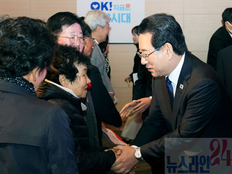 김영록 전라남도지사가 1일 전남도청 김대중강당에서 열린 ‘제107주년 3·1절 기념식’에서 독립유공자 후손들을 격려하고 있다.