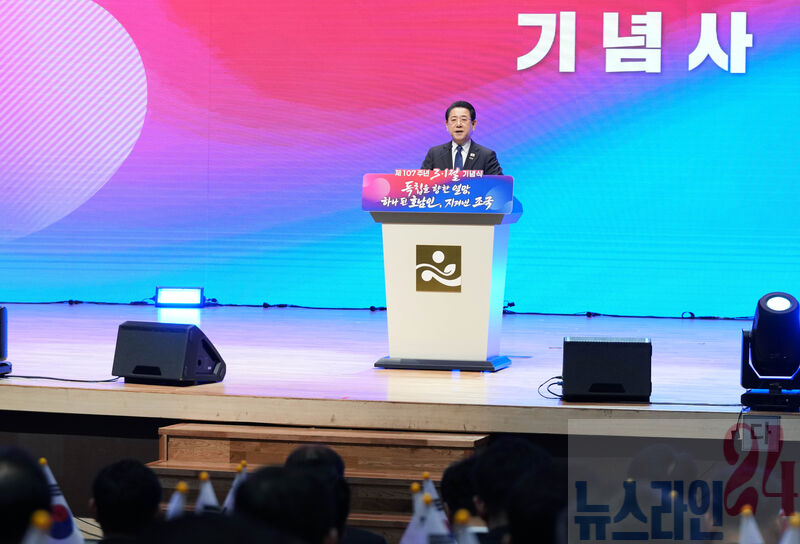 김영록 전라남도지사가 1일 전남도청 김대중강당에서 열린 ‘제107주년 3·1절 기념식’에서 기념사를 하고 있다.
