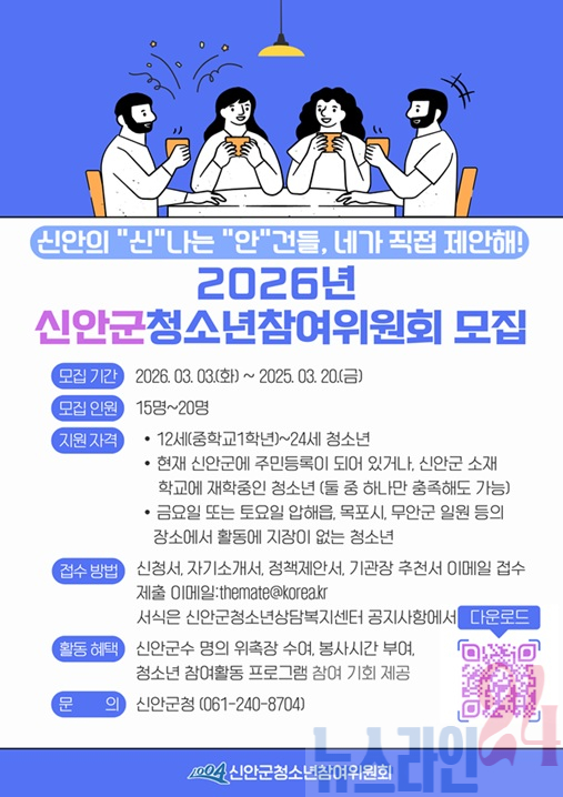 2026년 신안군청소년참여위원회 모집 안내문 신안군이 지역 청소년들의 생생한 목소리를 정책 현장에 직접 담아내기 위해 ‘2026년 신안군 청소년참여위원회’ 신규 위원을 모집한다.