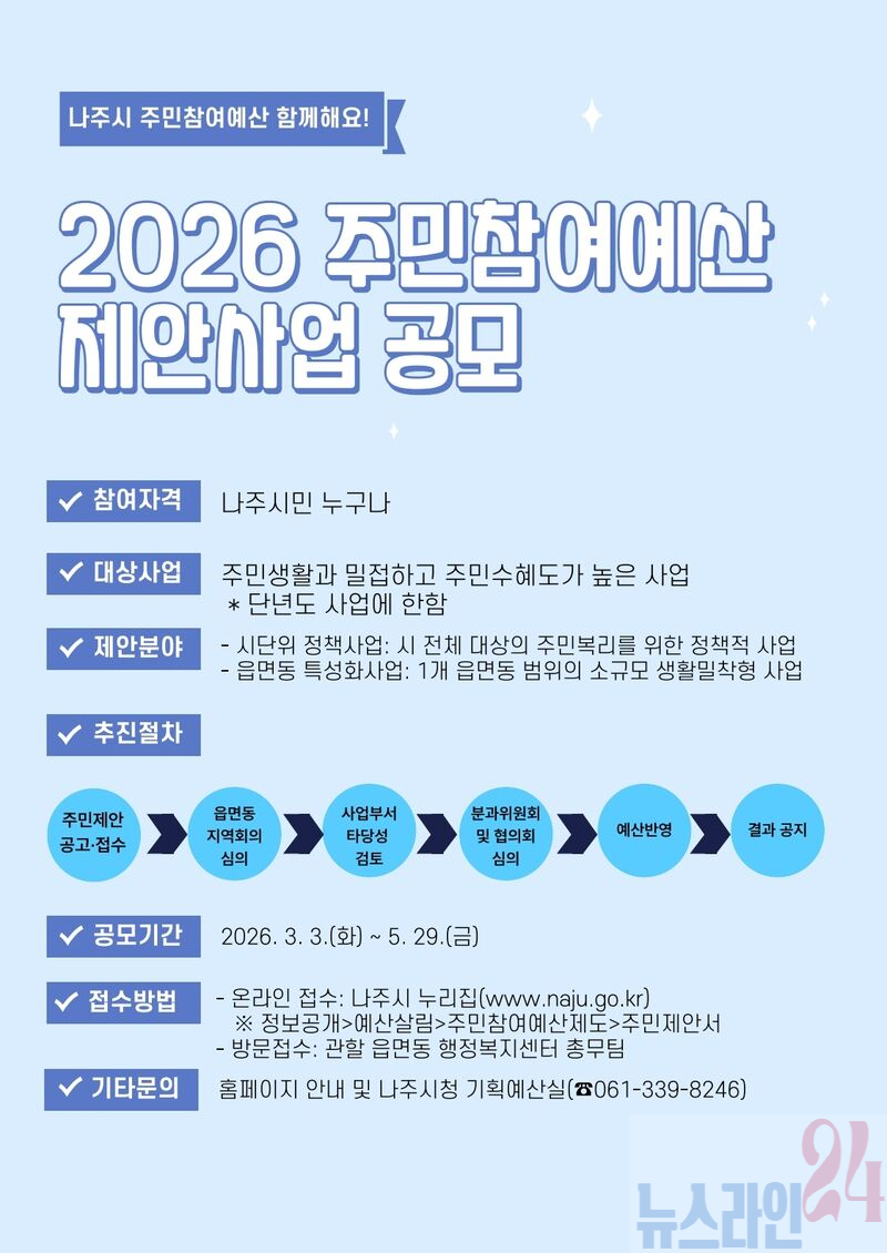 나주시는 2027년 본예산에 반영할 주민참여예산 제안사업 공모를 오는 5월 29일까지 진행한다고 4일 밝혔다.