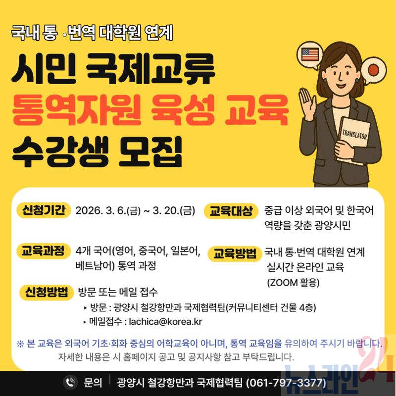 광양시는 국제 자매·우호도시 교류와 각종 국제행사 등 국제교류 현장에서 활동할 전문 통역 인력을 체계적으로 육성하기 위해 「국내 통·번역 대학원 연계 시민 국제교류 통역자원 육성 교육」 수강생을 3월 6일부터 20일까지 모집한다.