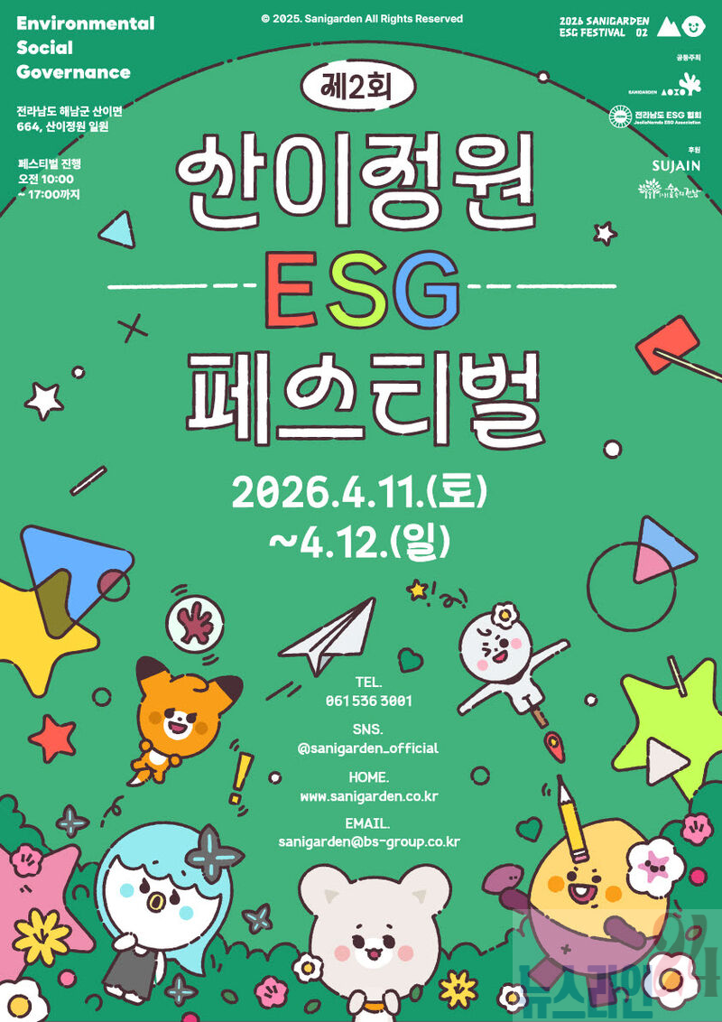산이정원 제2회 ESG 페스티벌 포스터전남 해남에 위치한 산이정원이 전라남도ESG협회와 함께 오는 4월 11일부터 12일까지 이틀간 ‘제2회 ESG 페스티벌’을 개최한다. 이번 행사는 환경(Environmental), 사회(Social), 지배구조(Governance)의 가치를 정원이라는 공간에서 실천적으로 구현하기 위한 지속가능 문화축제로 마련됐다.