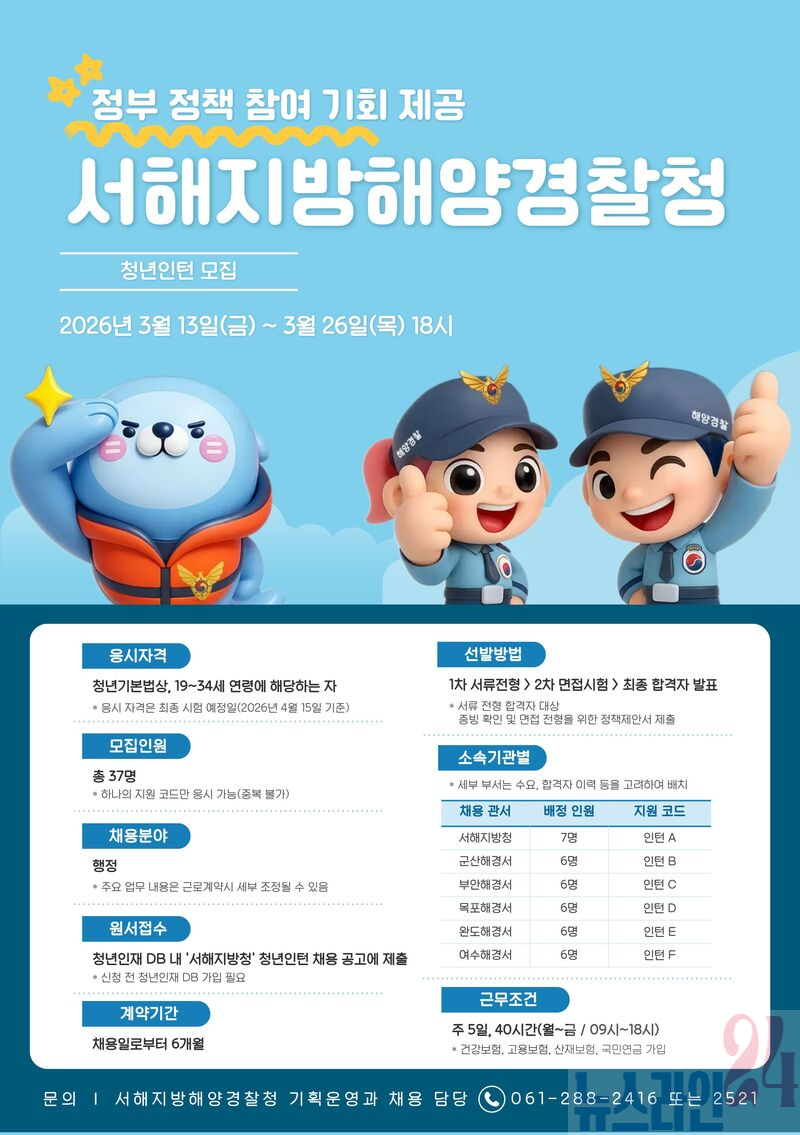 서해지방해양경찰청(치안감 백학선)은 청년세대(19세 이상 ~ 34세 이하대상 정책 참여 경험 제공 등을 위해 오는 13일부터 26일까지 14일간 2026년 청년인턴 채용을 실시한다고 밝혔다.