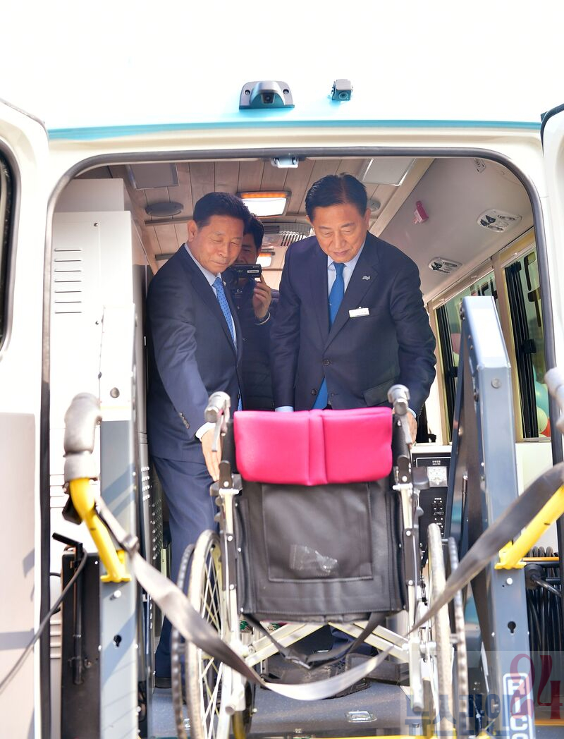 김한종 군수(우), 심민섭 의장(좌)이 구강버스 내부 시설을 살펴보고 있다. [장성군]