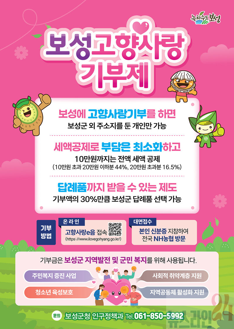 또한 고향사랑기부금으로 조성된 기금은 지역 문제 해결과 주민 복리 증진을 위한 사업에 활용되며, 보성녹차, 벌교꼬막 등 지역 특산품 중심의 답례품 제공을 통해 지역 소상공인의 매출 증대와 지역경제 활성화에도 도움이 될 것으로 기대된다.