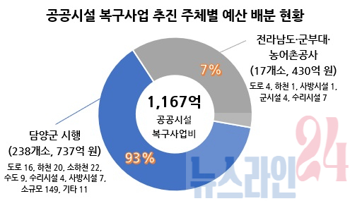 담양군이 확보한 복구비 1,230억 원은 크게 ‘공공시설 복구비(1,167억 원)’와 ‘사유시설 재난지원금·위로금(63억 원)’으로 나뉜다.