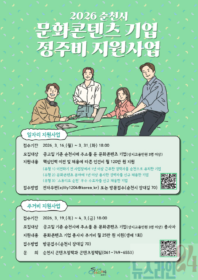 시 관계자는 “이번 정주 지원사업은 이전 콘텐츠 기업들의 현장 수요를 반영해 올해 처음 추진하는 정책”이라며 “기업과 인재가 안정적으로 정착해 성장할 수 있는 환경을 조성해 콘텐츠가 생산되고 머무는 도시, 순천의 미래 산업을 더욱 강화해 나가겠다”고 말했다.