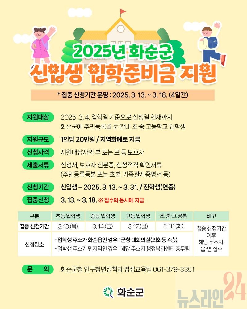 입학준비금 지원 대상은 2025년 3월 4일 기준으로 화순군에 주민등록을 두고 관내 초·중·고등학교에 입학하거나 전입하는 1학년 학생이다.